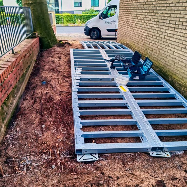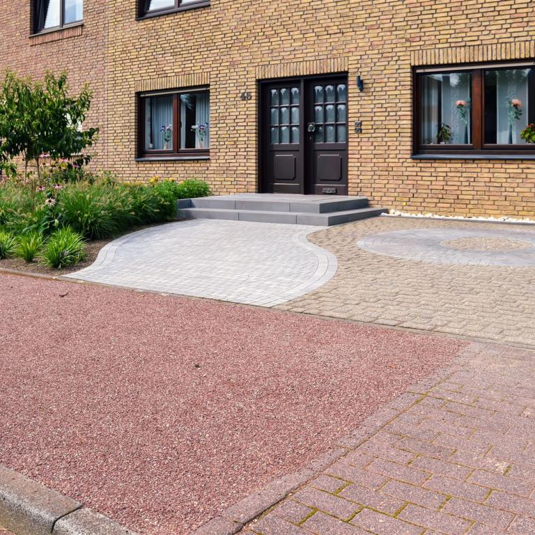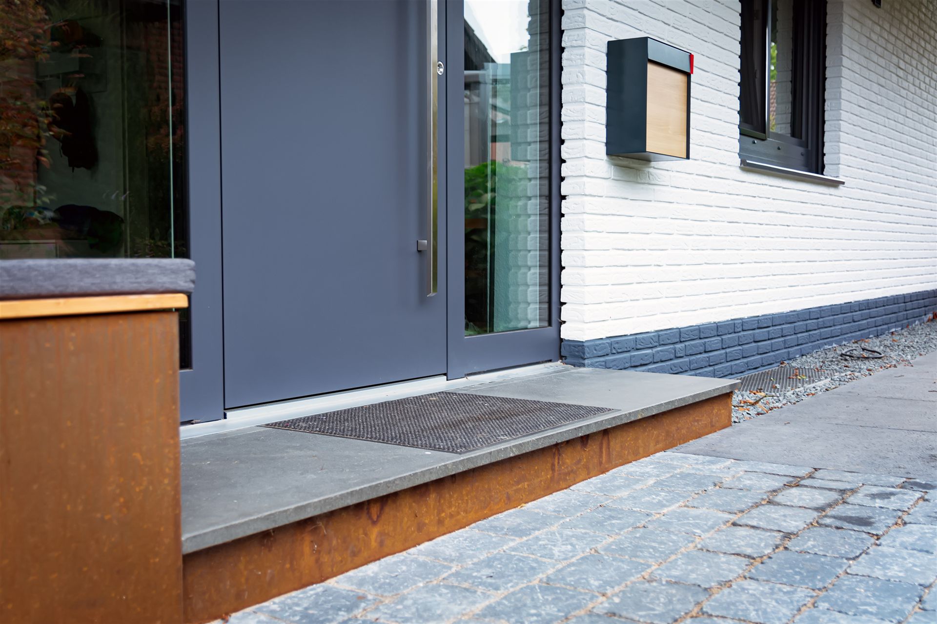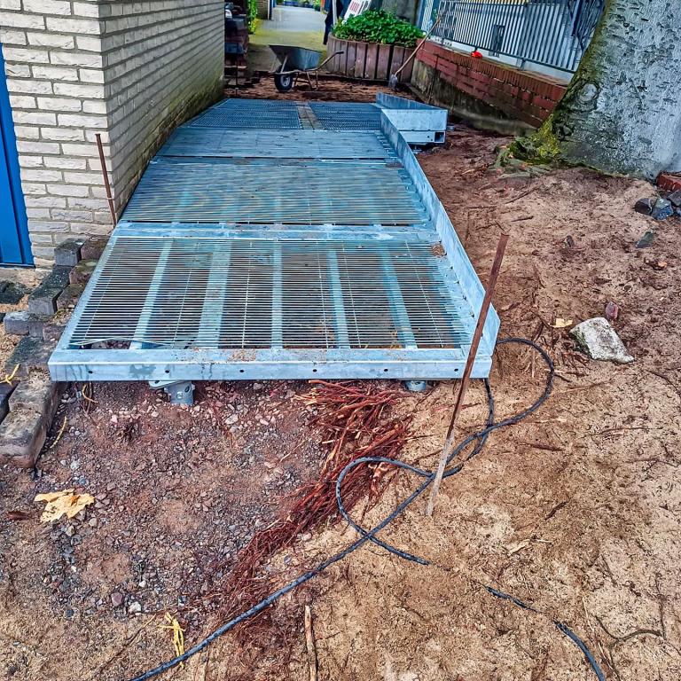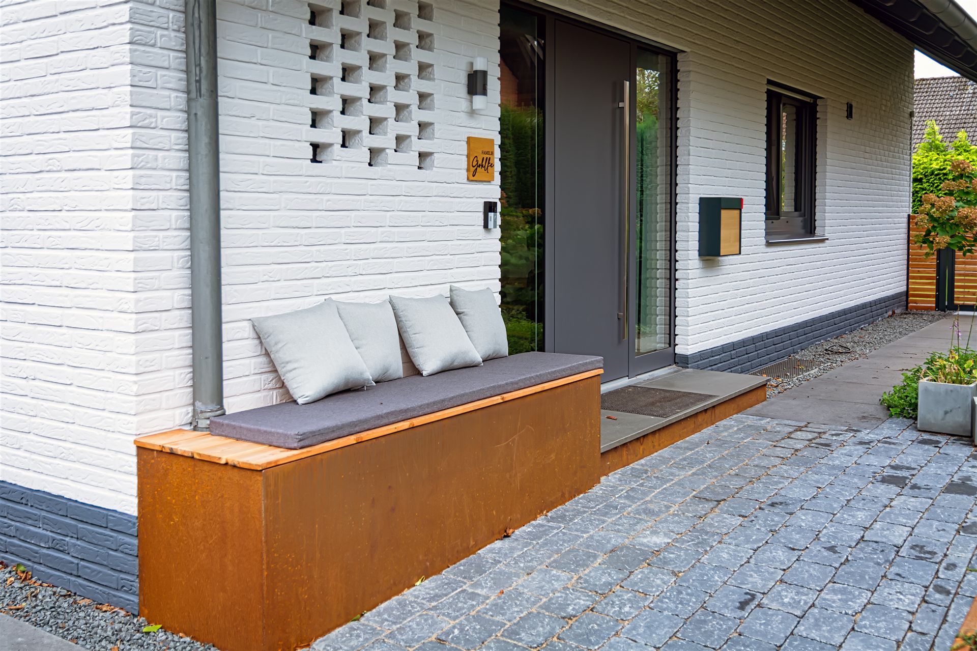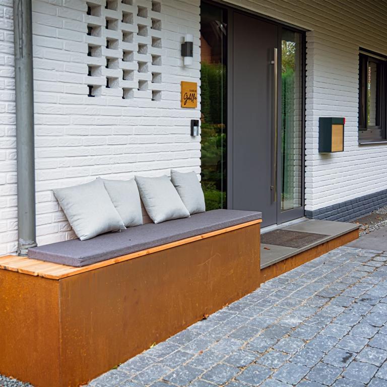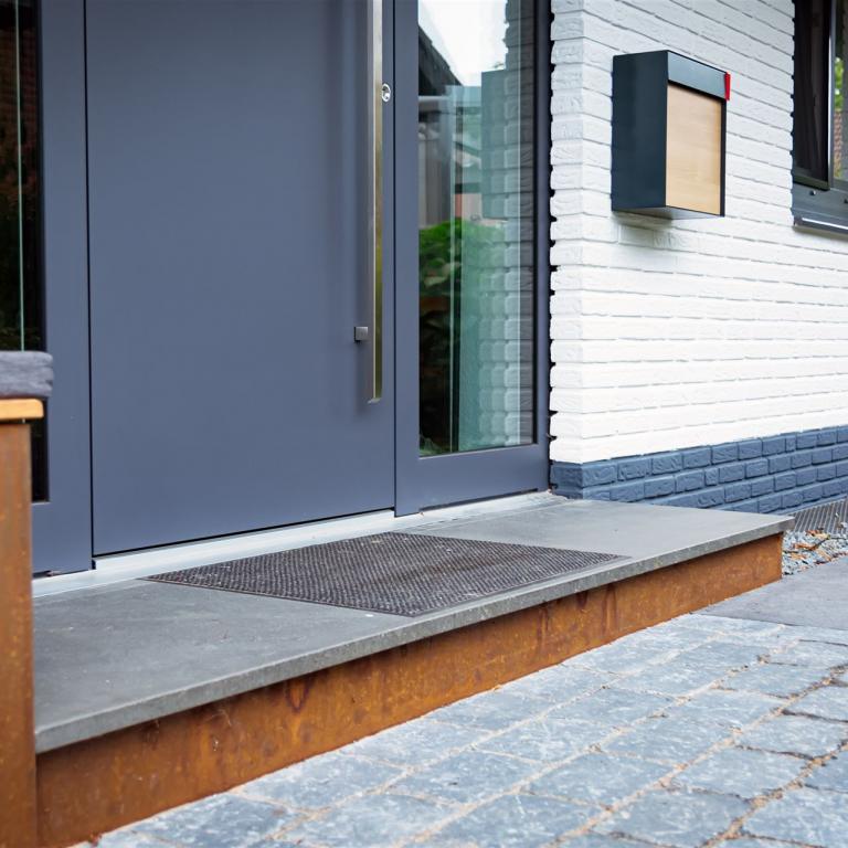 Hauseingang mit Weg und Sitzbank aus Stahl vorher und nachher...