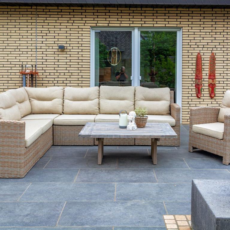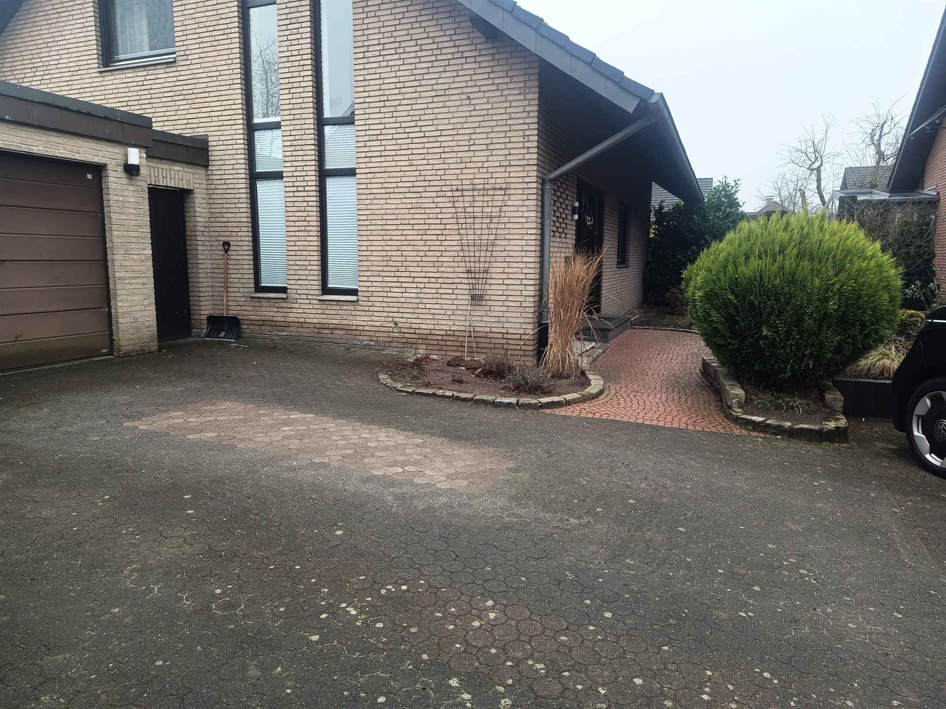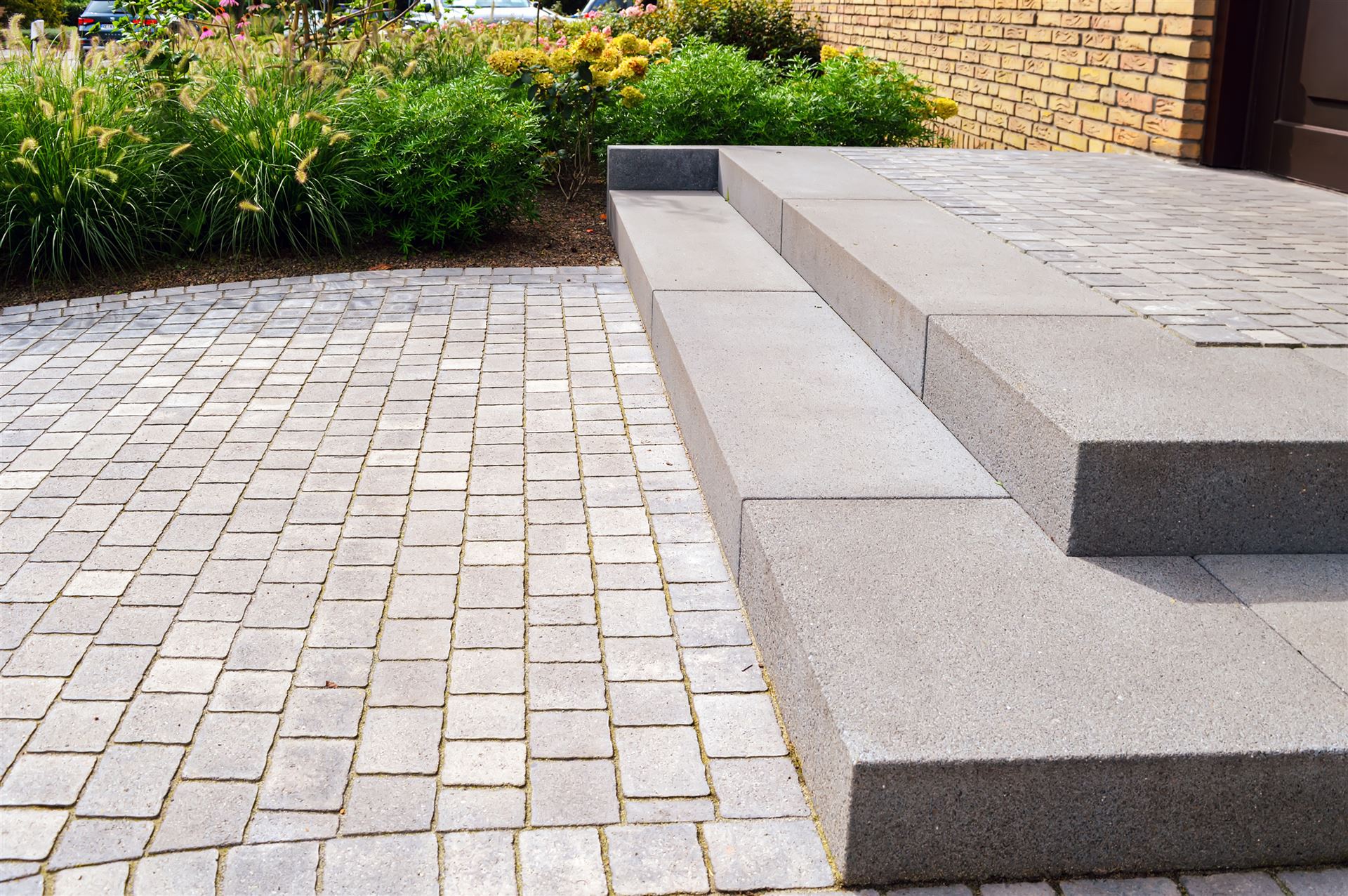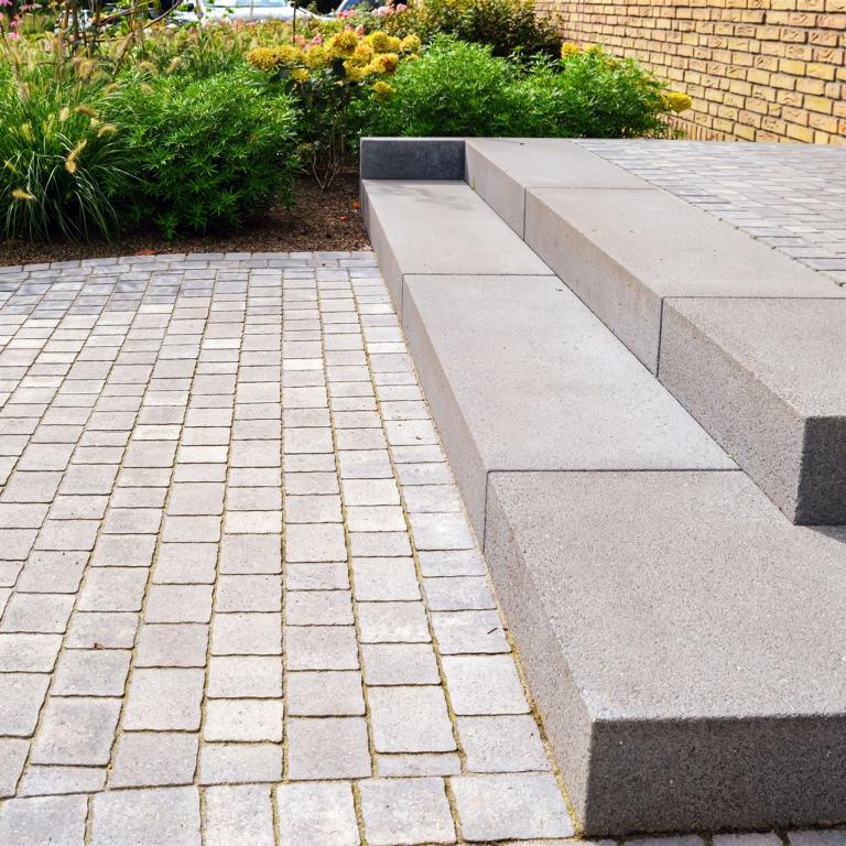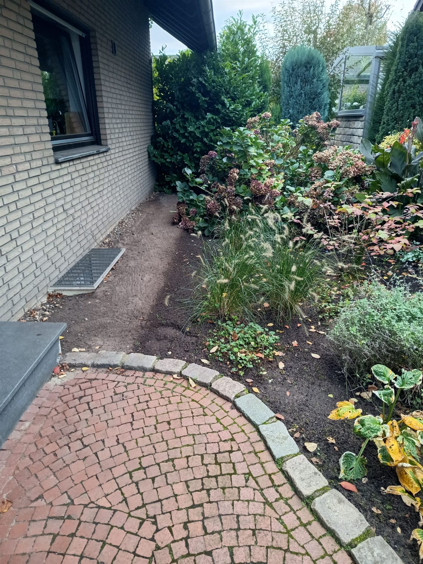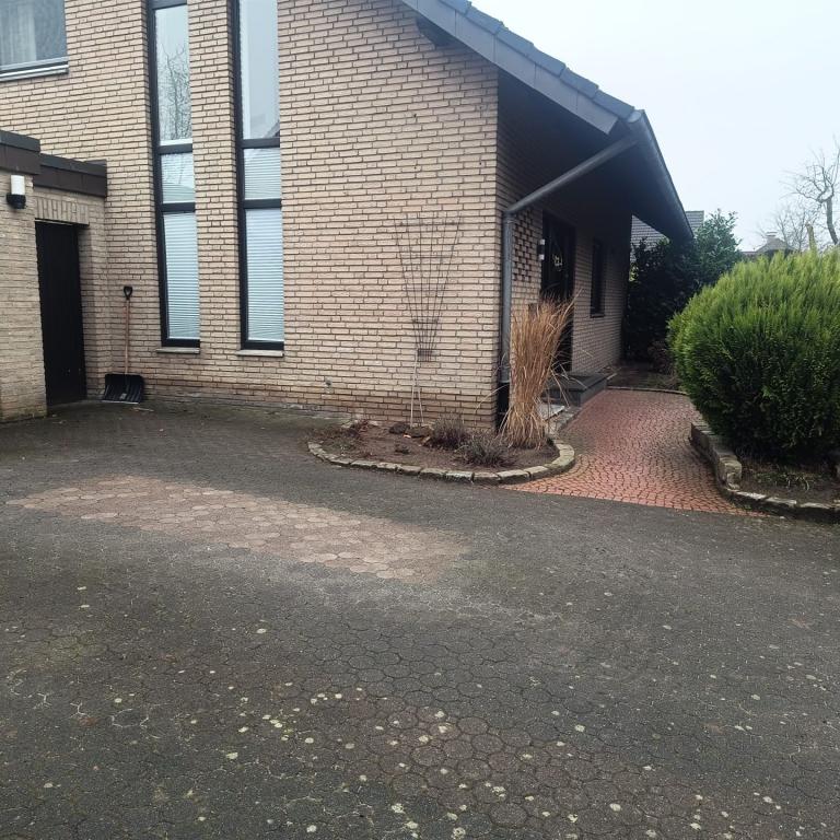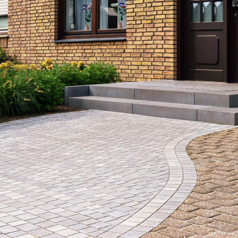 Hauseingang mit Weg und Sitzbank aus Stahl vorher und nachher...