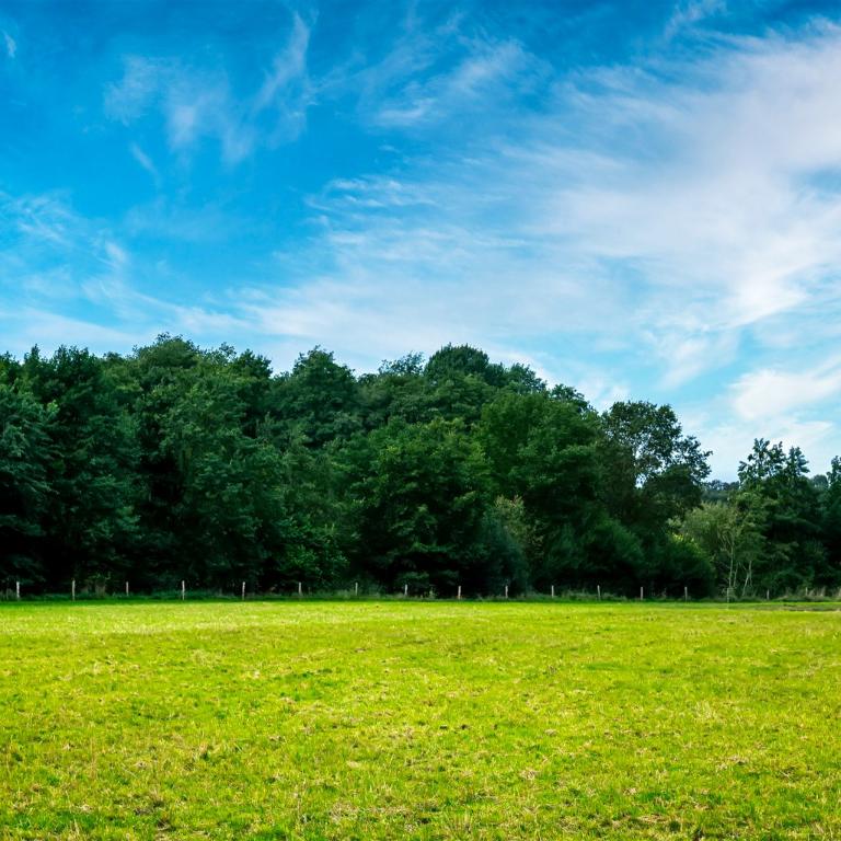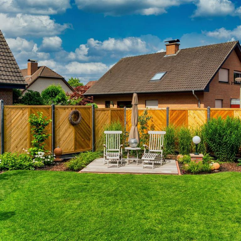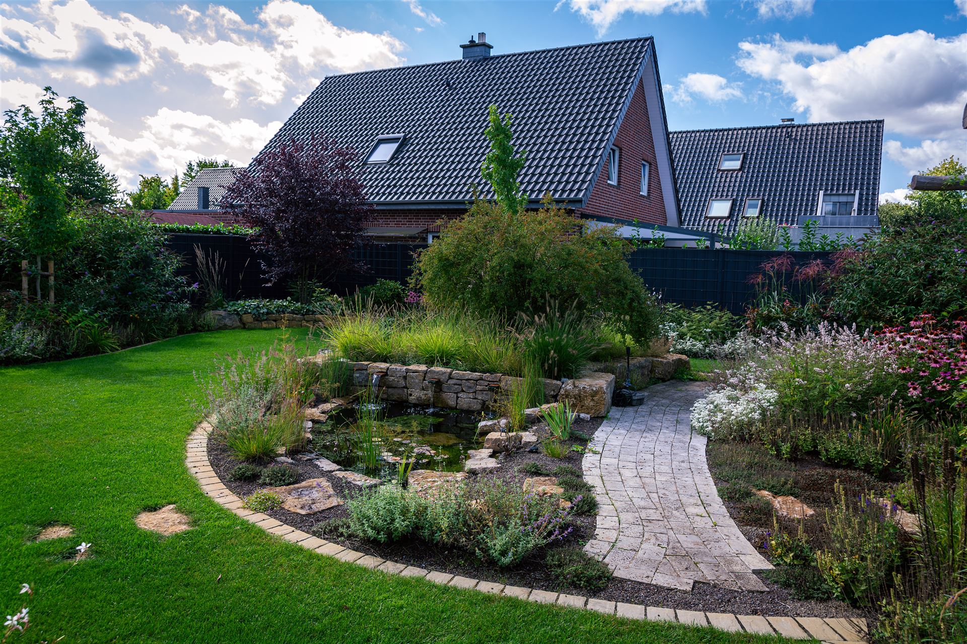Gartenanlage mit Teich und Einzäunung