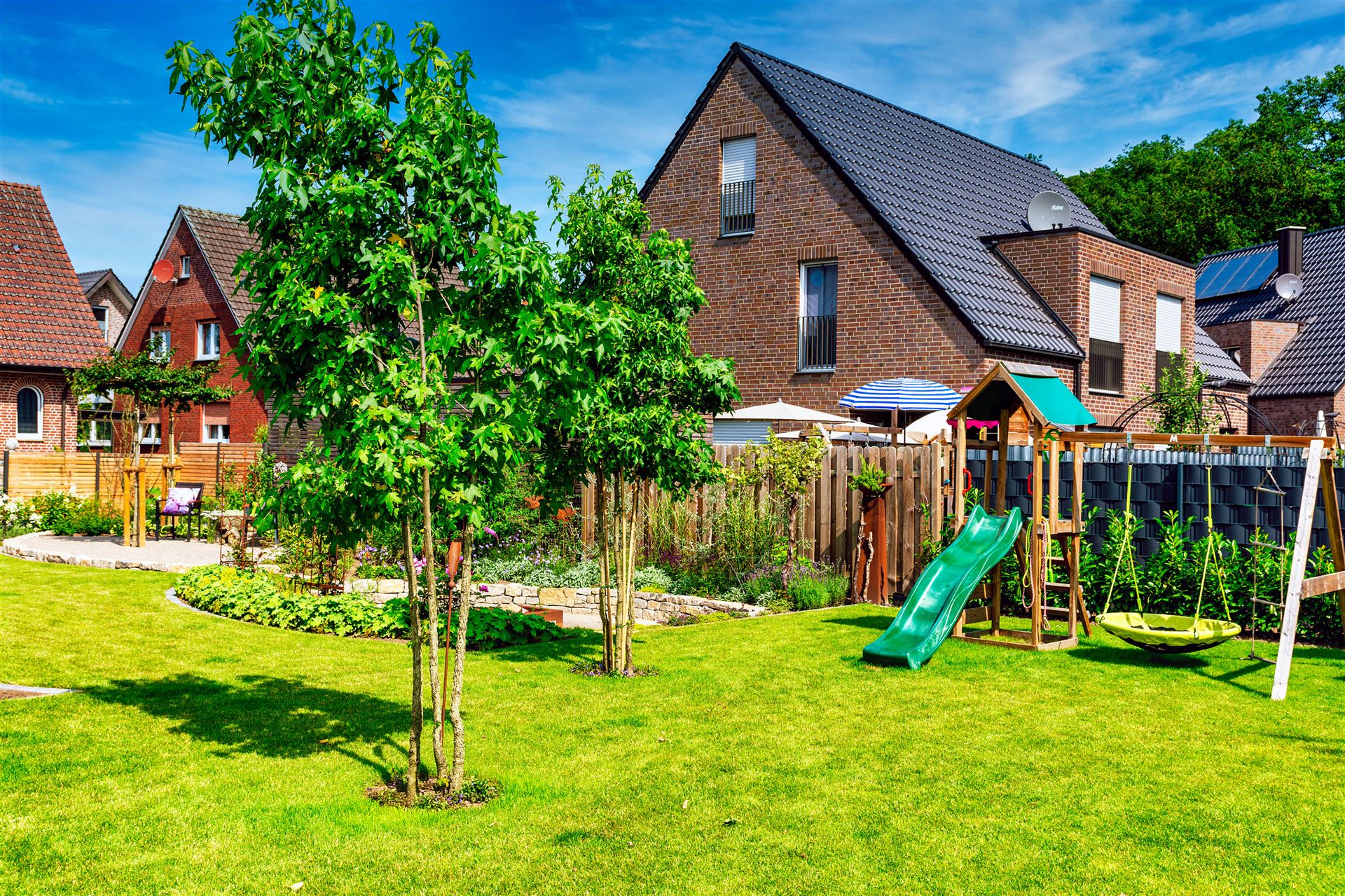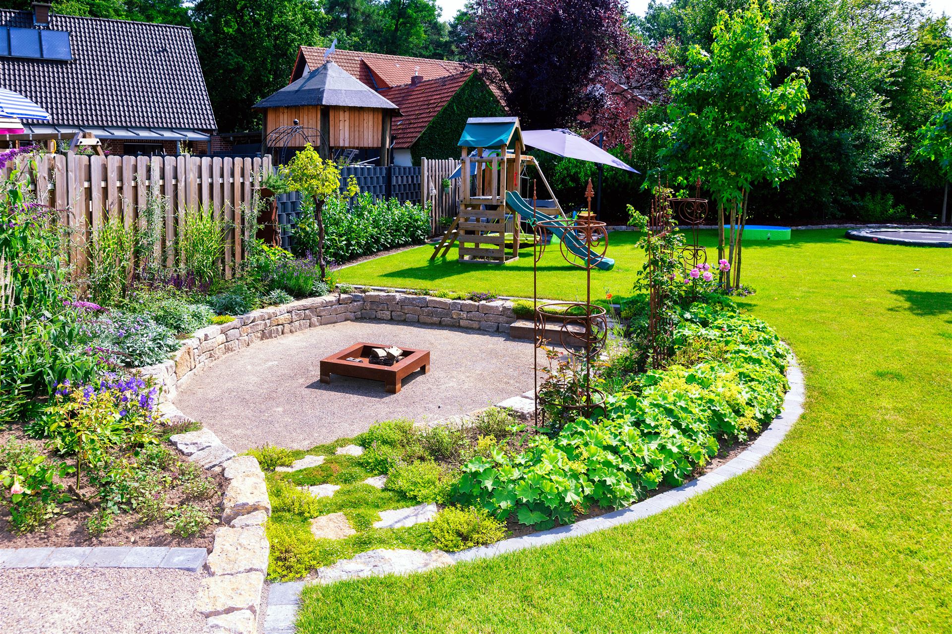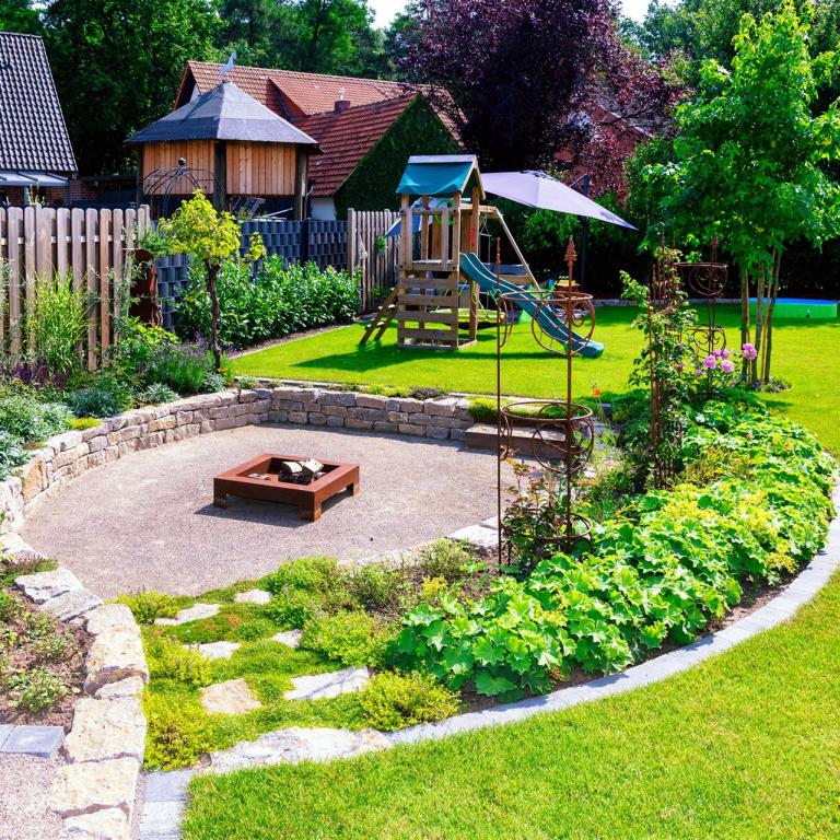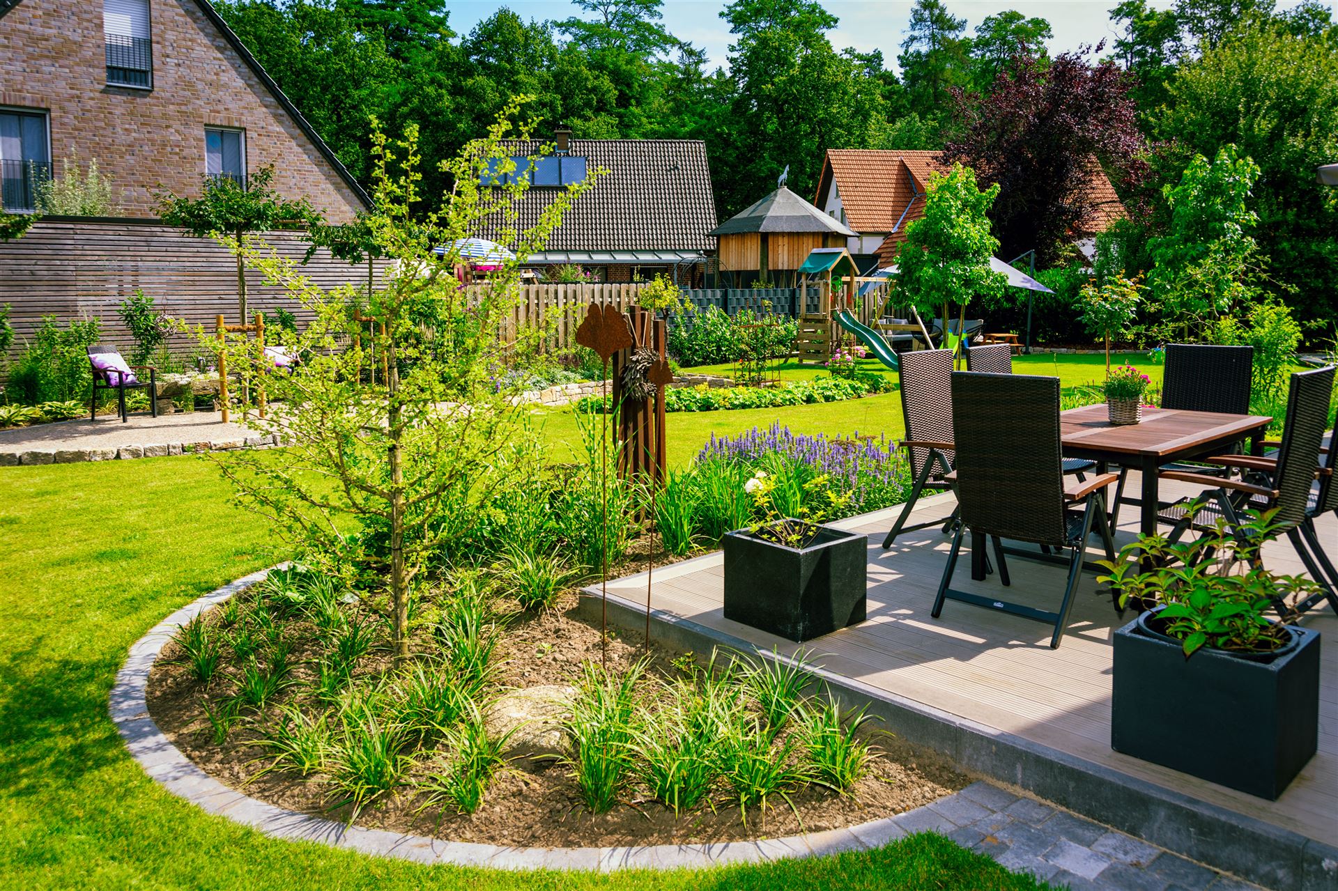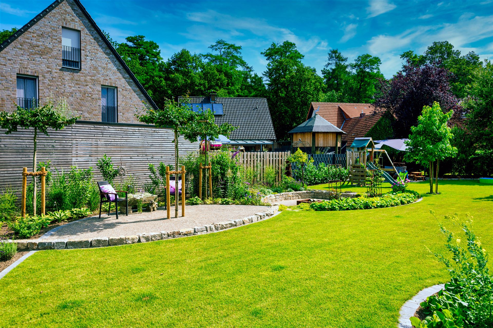 Komplette Gartengestaltung mit Pflastung und Spielplatz mit Gartenhaus