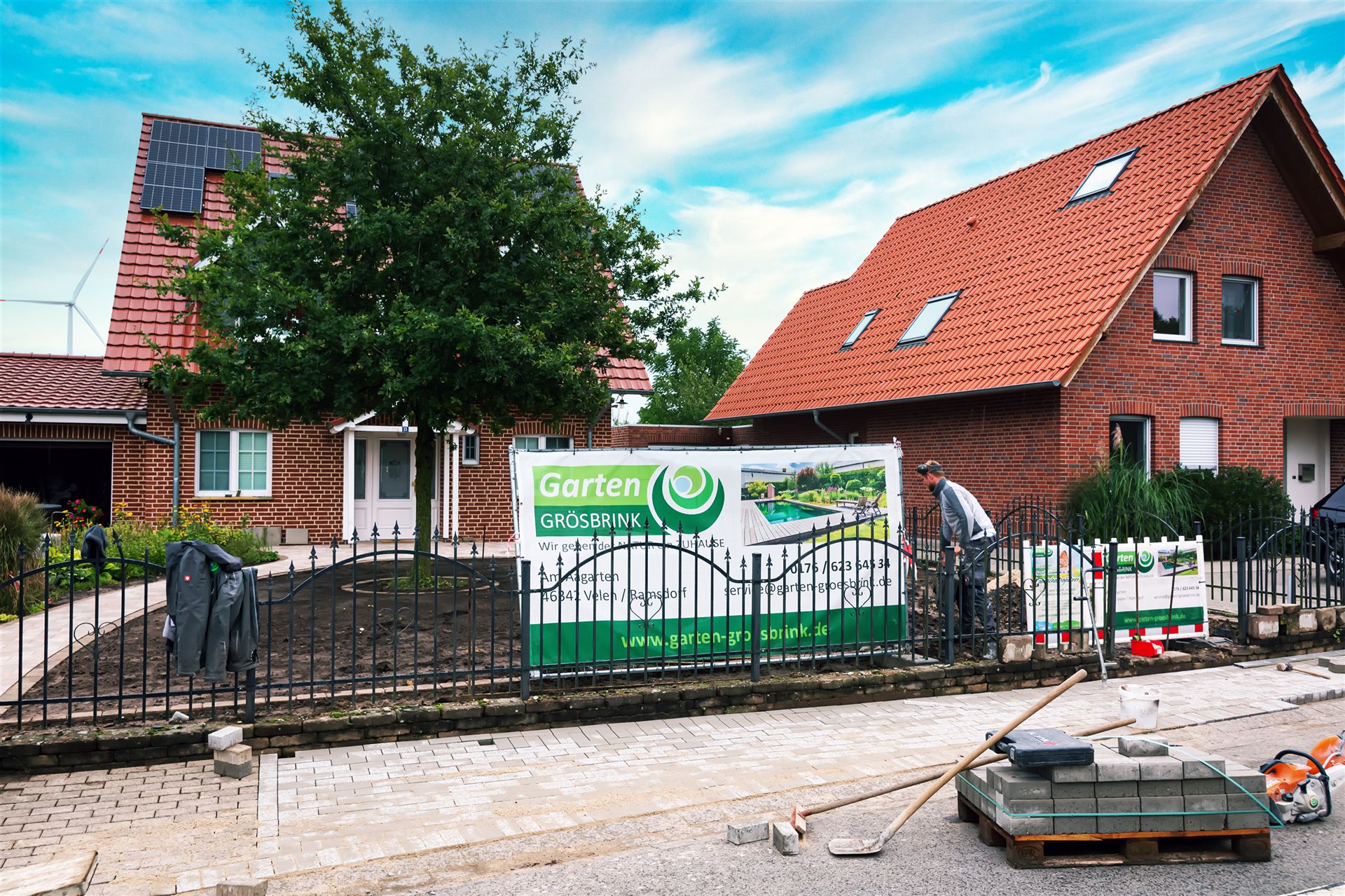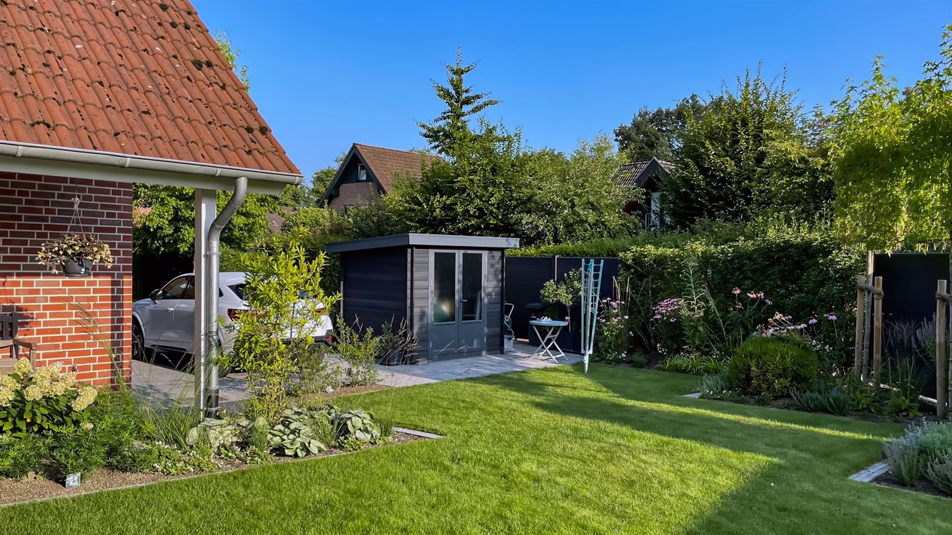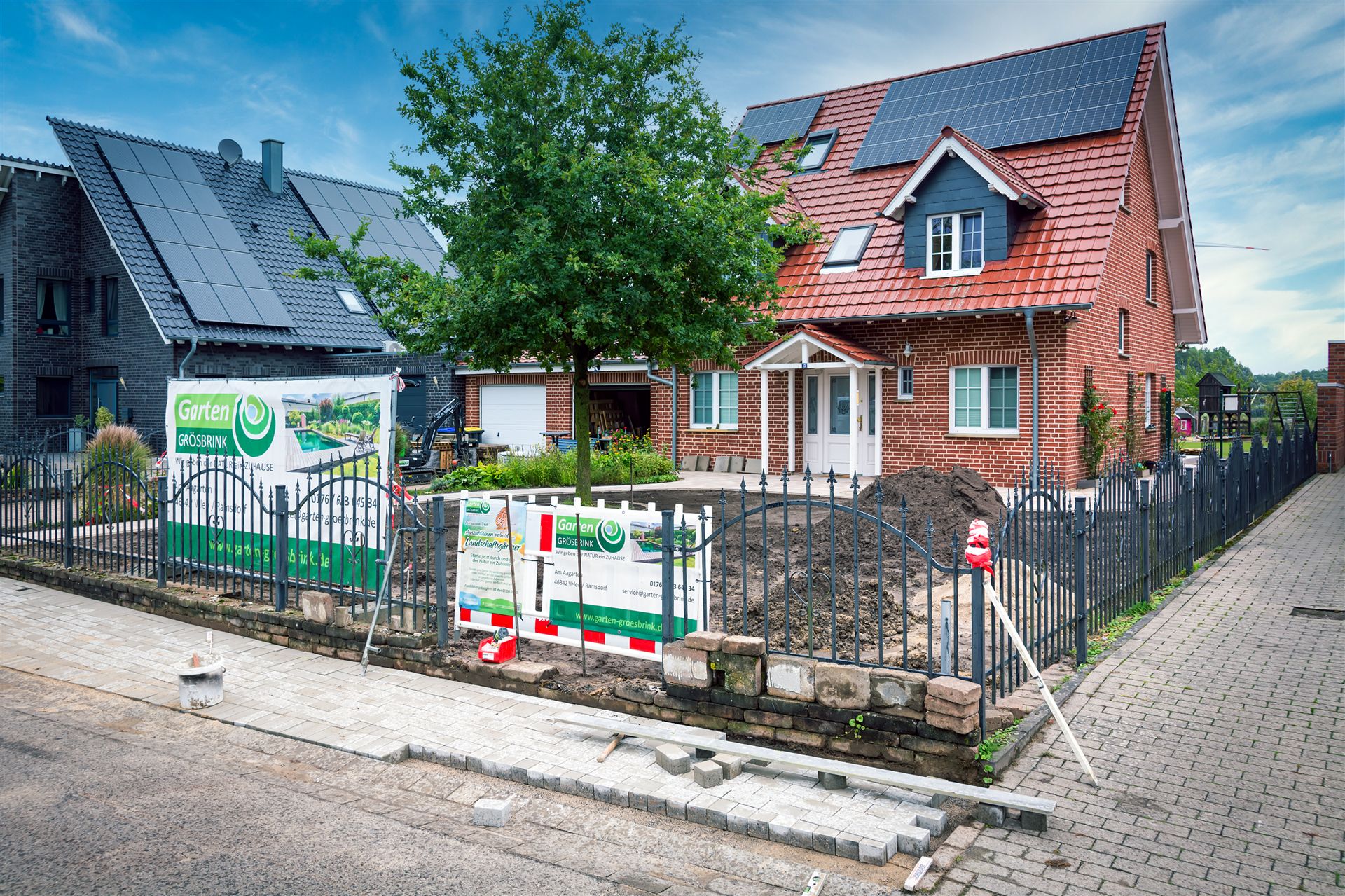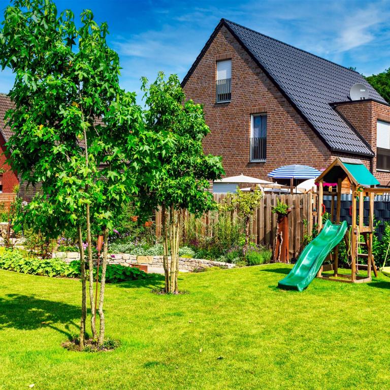 Komplette Gartengestaltung mit Pflastung und Spielplatz mit Gartenhaus