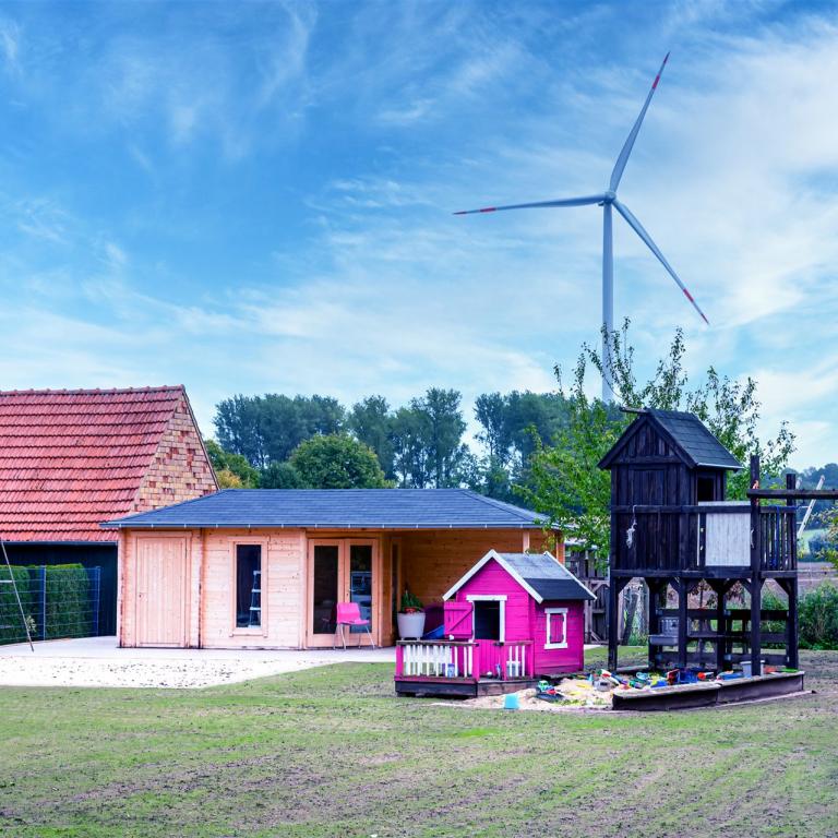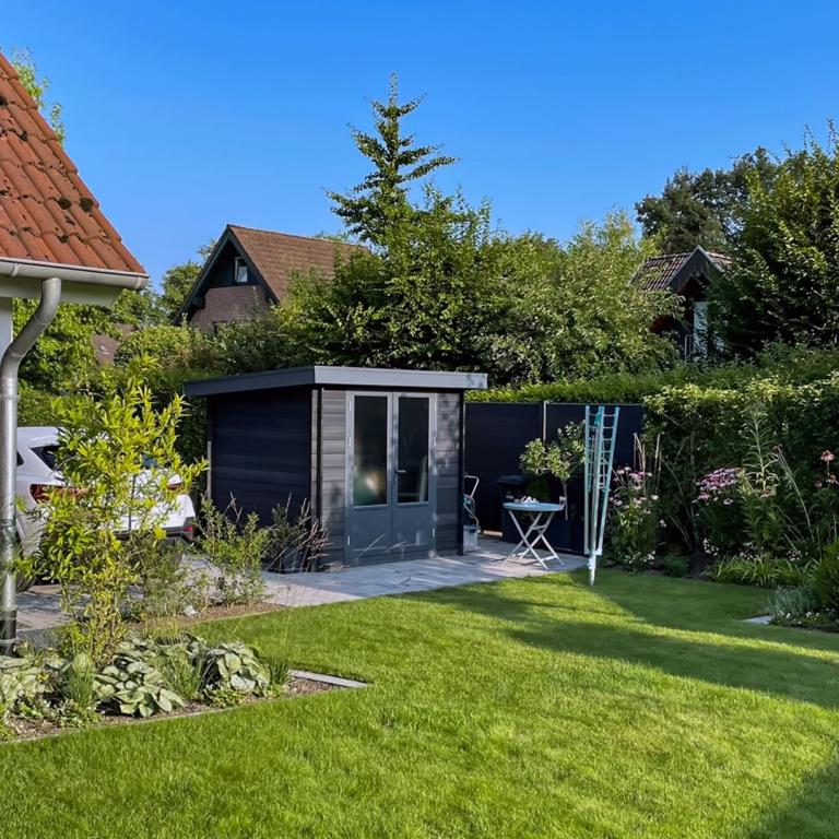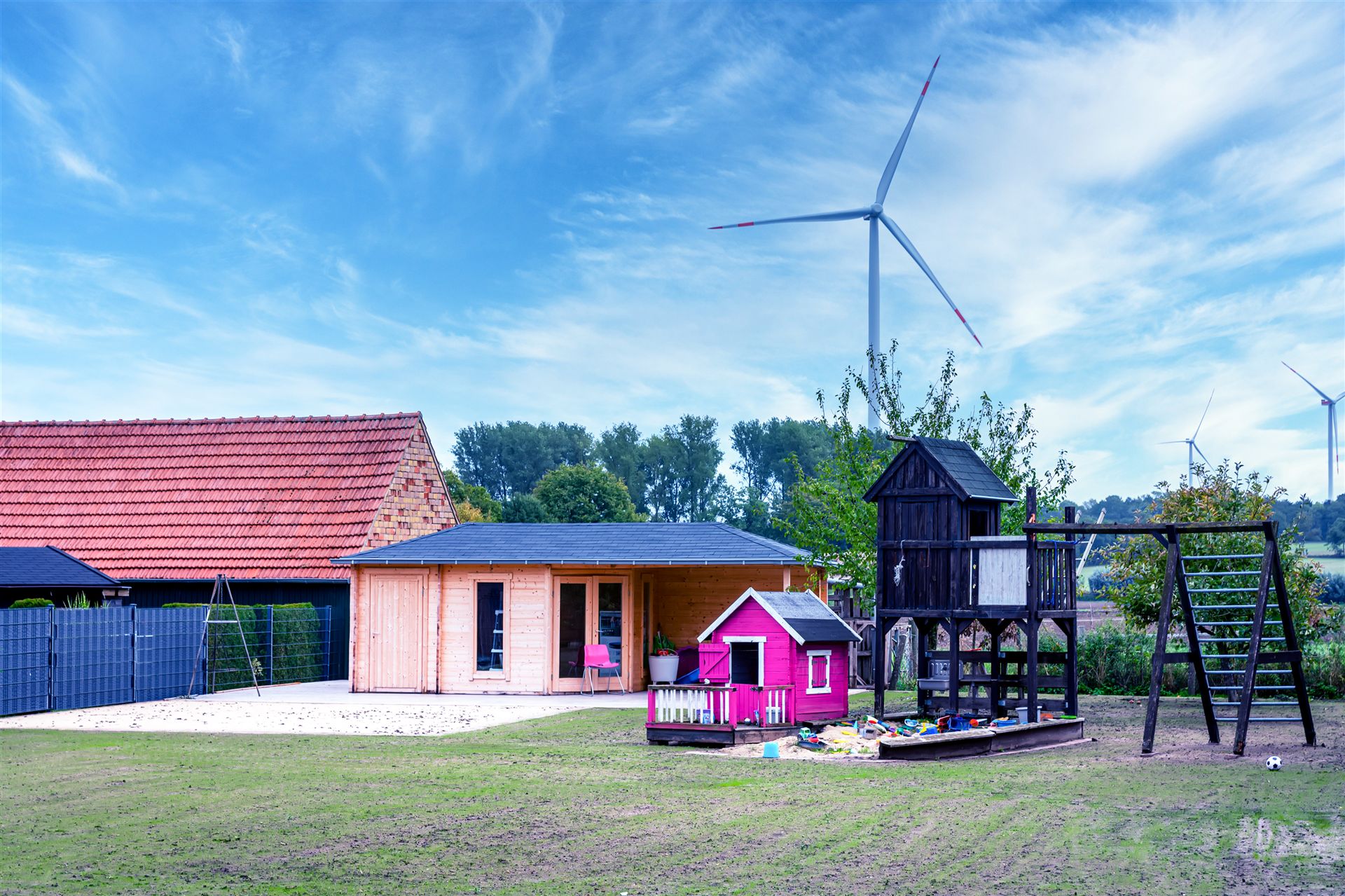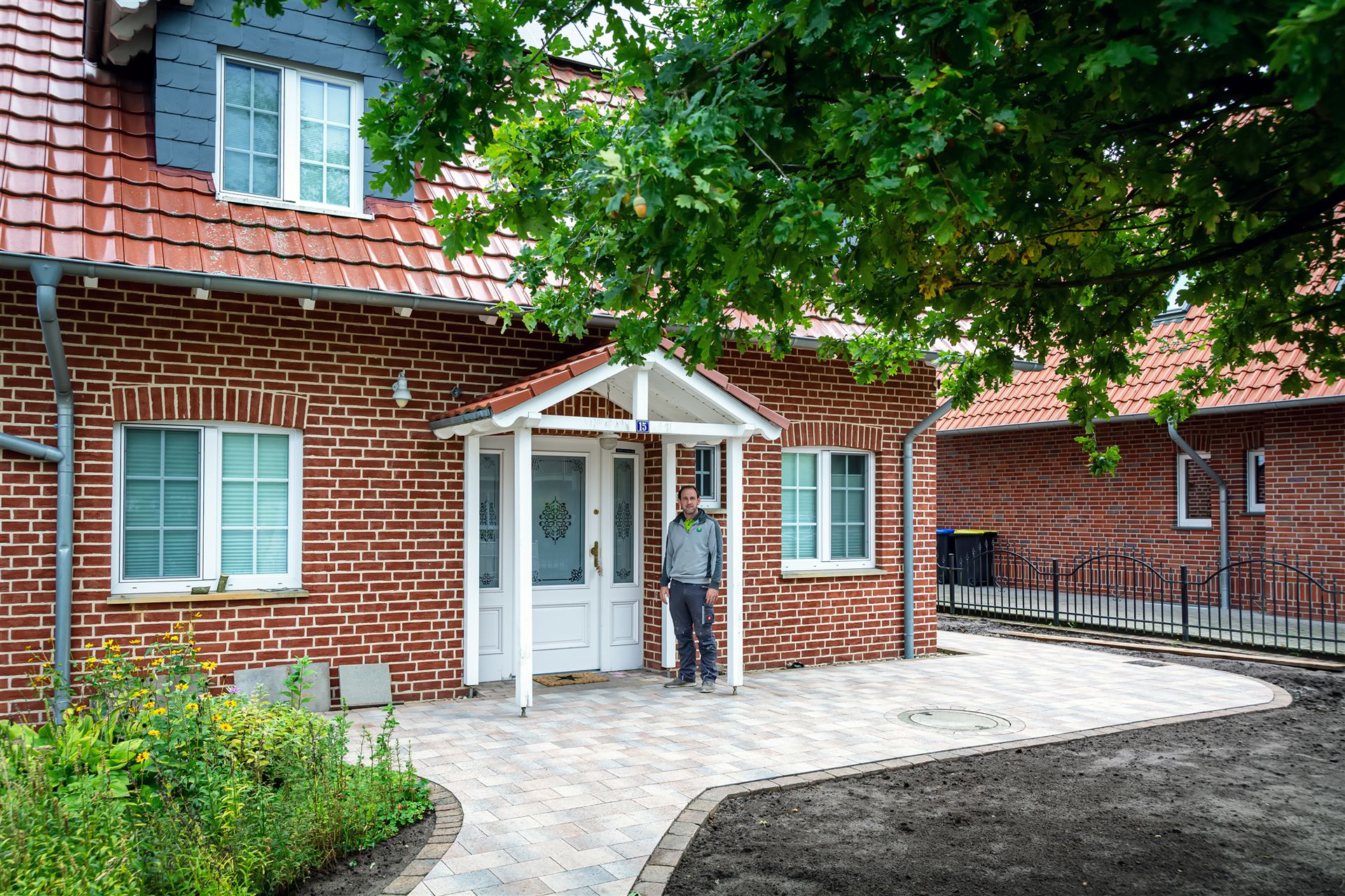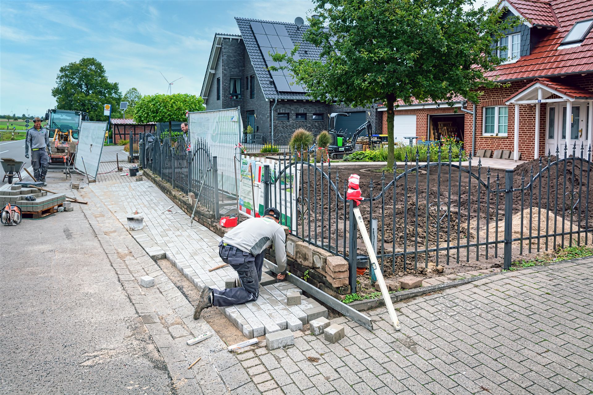 Komplette Gartengestaltung mit Pflastung und Spielplatz mit Gartenhaus