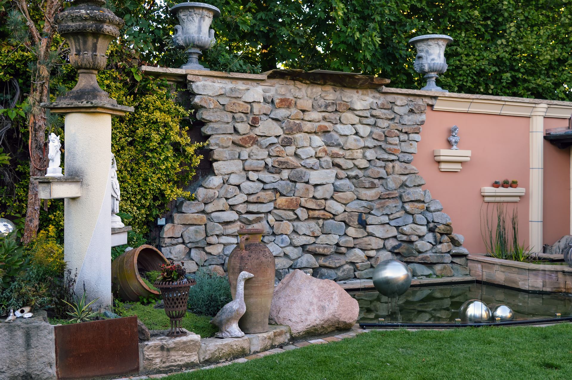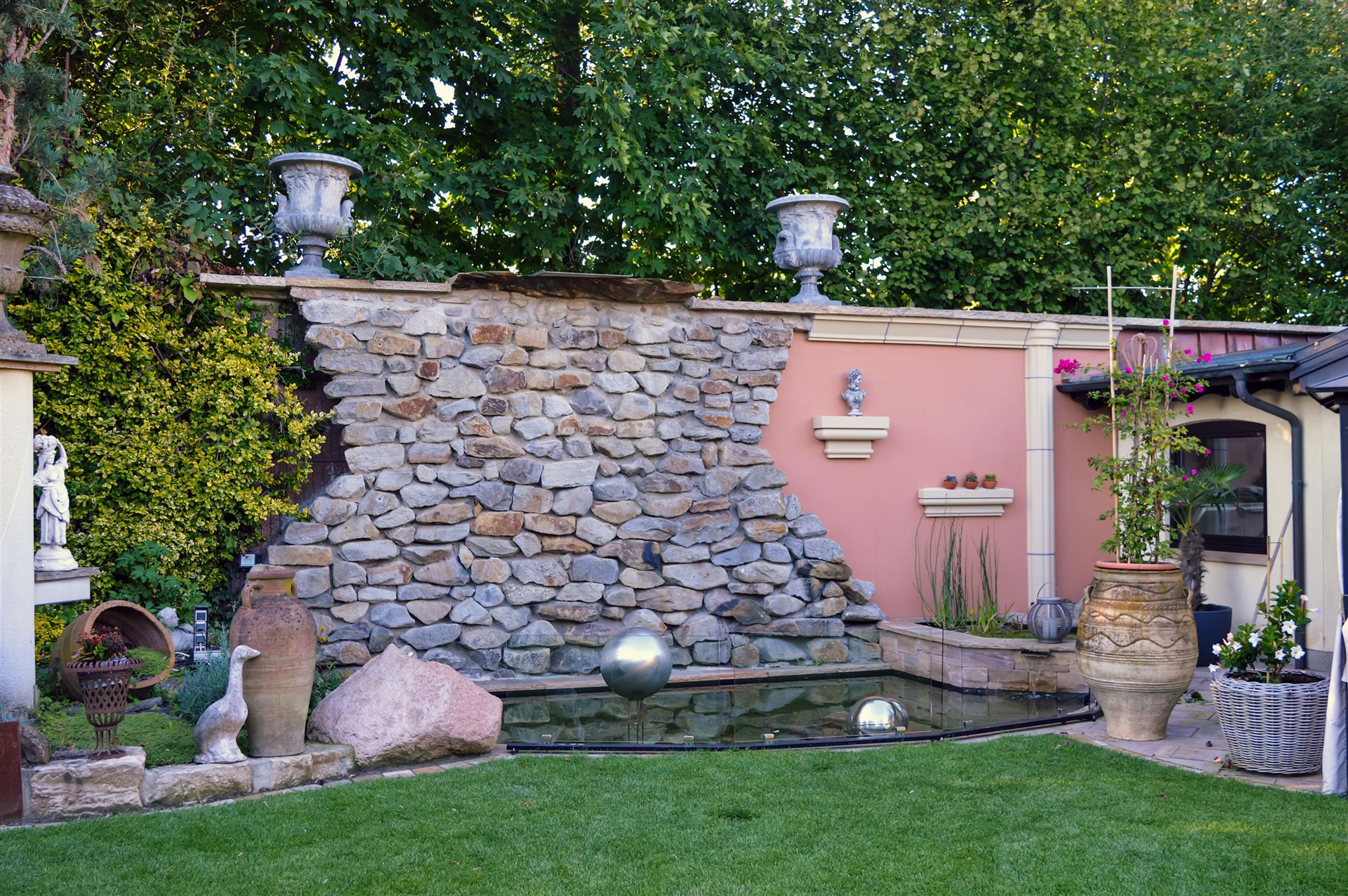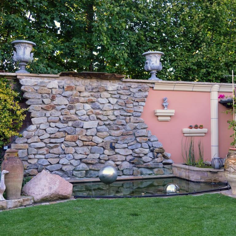 Steinwand mit Teichanlage